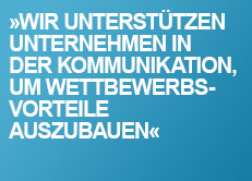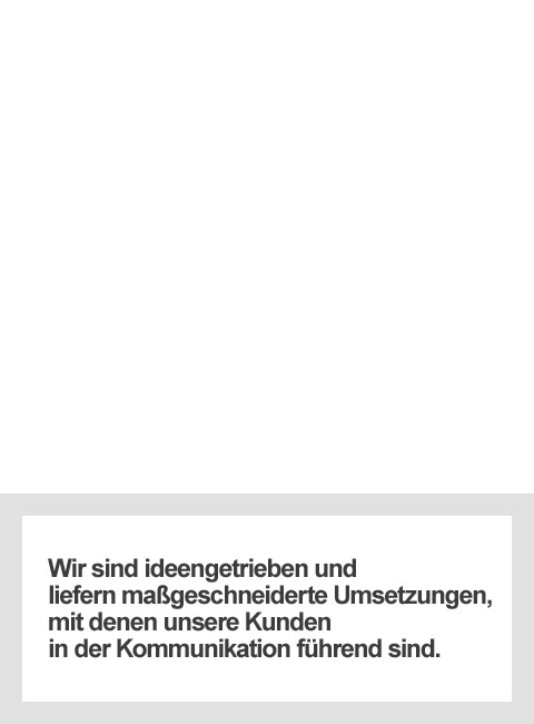| Kommunikations-Agentur deshalb, weil der Begriff Kommunikation mehr umfasst als klassische Werbung. Unser Angebot berücksichtigt alle Schnittstellen im Unternehmen und integriert die Wünsche und Bedürfnisse der anvisierten Zielgruppen. Inhabergeführt, weil Kontinuität in der Beratung für bessere Ergebnisse sorgt, als dies durch wechselnde Berater möglich ist. Und weil Entscheidungsautonomie die Sicherheit gibt, dass die Agentur langfristige und gemeinsame Interessen mit dem Kunden verfolgt. Unser Anspruch ist es, strategisch und kreativ herausragende Lösungen zu entwickeln, die glaubwürdig und nachhaltig den Unternehmenserfolg fördern. Dazu stellen wir ein Team zusammen, das zuhört, das objektive Perspektiven entwickelt, technisches Know-how besitzt und statt Empfehlungen einsetzbare Maßnahmen entwickelt, um einen messbaren Mehrwert aus der Zusammenarbeit zu bieten. Wir arbeiten ausschließlich projektorientiert als Problemlöser. Unser Angebot beginnt bei der Einzelberatung und reicht bis zur Generalunternehmerschaft. |