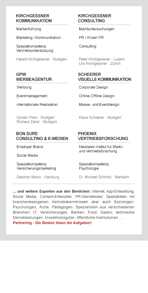 | Die Welt wird komplexer und alles dreht sich immer schneller. In diesem Wettbewerb um bessere Lösungen bieten wir mit unserem Partnering-Konzept eine Alleinstellung. Kirchgessner Kommunikation arbeitet seit Jahren international mit multidisziplinären Teams zusammen. Aufgabenbezogen binden wir Experten in die Entwicklung kreativer Lösungen ein. In der Agentur fließen die Ergebnisse zusammen. Dabei sind wir der Ansprechpartner für unseren Kunden. Der Mehrwert: Wir fügen maßgeschneidert zusammen, was zu einer besseren Lösung führt. Damit bieten wir Kunden mehr und bessere Chancen, ihre Differenzierung stärker zu kommunizieren. Die Unternehmen können Kraft aus der Vernetzung schöpfen und die kollaborative Kreativität nutzen. Ein weiterer Vorteil: die Vergütung orientiert sich an abgerufenen Leistungen. Somit passt sich das Partnering-Konzept perfekt an das Unternehmen und die Aufgabe an und bietet alle Transparenz. Zu Kirchgessner: persönlich sind wir Cousins und gleichzeitig von einander unabhängige Unternehmen mit verschiedenen Kompetenzen. Kirchgessner in der Schweiz ist eine Boutique, für schlanke und schnelle Marktforschung, auf höchstem Niveau. Und in Stuttgart stehen wir für Kommunikation. |
