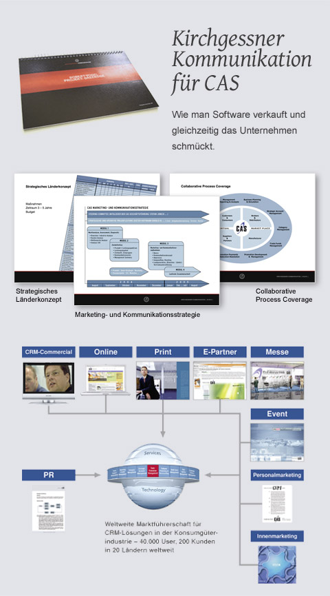 Strategie: Der Markenauftritt und alle Maßnahmen mussten sich an Weltmarktanforderungen messen. Im Zentrum der Kommunikation: der Dialog mit jedem einzelnen Unternehmen. CAS konnte diesen Unterschied in der Akquise gegenüber den Wettbewerbern leisten und individuell durchhalten. Von innen heraus, mit den besten Lösungen und Referenzen ausgestattet, ging CAS den Premiumweg.