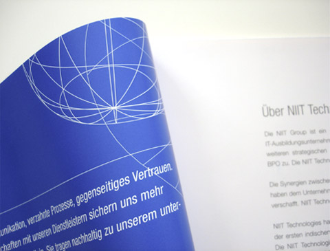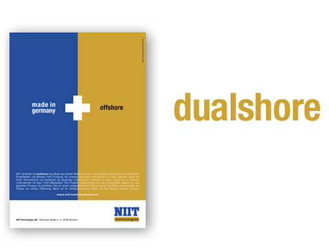 Nach Austausch mit dem Management entwickelte Kirchgessner Kommunikation die neue Positionierung „dualshore“ und entwarf die Kommunikations-instrumente. Erstmals wurde damit die Leistung von NIIT, die aus der Verbindung der beiden Welten: onsite (Deutschland) und offshore (Indien) besteht, einheitlich und ganzheitlich kommuniziert. Anschließend haben wir der Strategie das gestalterische Gesicht gegeben.