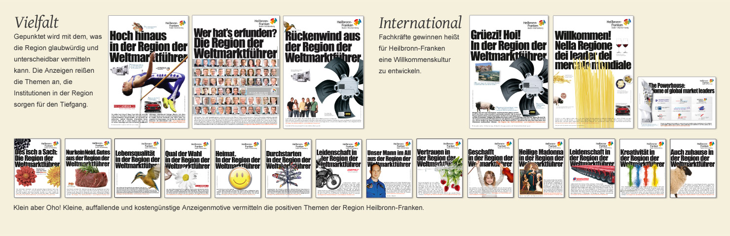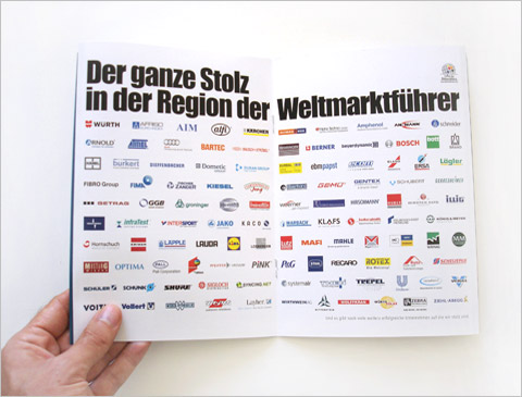 Die Vielfalt wird gebündelt unter dem Claim: Region der Weltmarktführer. Mit dem Claim besteht die Chance, die Region wiedererkennbar bei den relevanten Zielgruppen zu positionieren und nachhaltig die Zukunft der Region zu sichern.